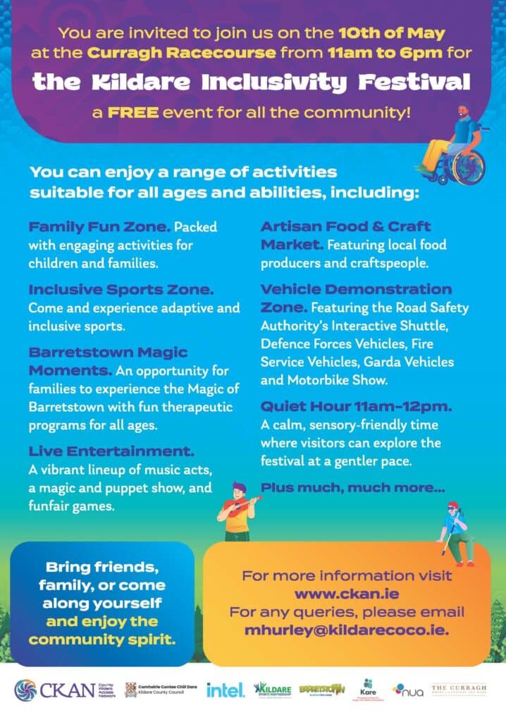 15 April 2026: Kildare County Council, in collaboration with the County Kildare Access Network (CKAN) and community partners, is delighted to announce the return of the Kildare Inclusivity Festival, a free, feel-good day out for all ages and abilities, taking place on Sunday, 10 May 2026 from 11am–6pm at The Curragh Racecourse.